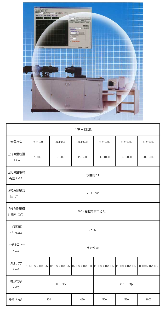 HYN系列微机伺服控制扭转试验机是本公司设计生产的系列定型产品。适用于各种材料、轴类、连接件、紧固件及各种零部件的扭转力学性能试验。配备自锁螺母夹具,可进行自锁螺母扭转试验。本机加荷系统采用伺服电机和摆线针轮减速机传动,扭矩和转角测量由高精度扭矩传感器和光电编码器组成。控制系统采用计算机闭环控制技术,具有等扭角速率、等扭矩速率控制,可进行扭矩保载、低周扭转疲劳试验。保护功能完善,如电机过流保护、扭矩过载保护、试样断裂保护等。程序采用WINDOWS2000/XP中文界面,操作简单、直观,具有试验过程实时采集,自动绘制扭转曲线,试验数据自动存储、试验结果智能运算处理(支持人工修正)及打印试验报告等功能
