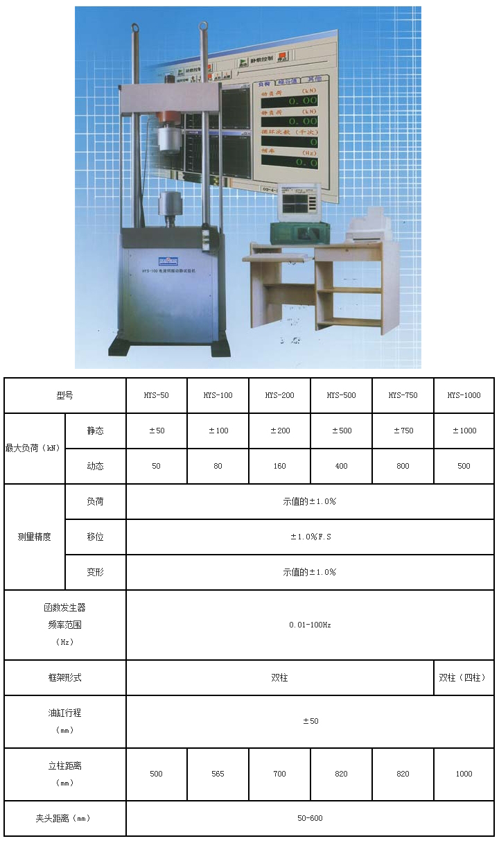 HYS系列电液伺服动静试验机。适用于各种金属材料、非金属材料、复合材料、各零部件的力学性能试验。配以各种夹具及高低温装置、能完成拉伸、压缩、低周和高周疲劳、裂纹扩展、断裂力学以及其他各种力学试验。